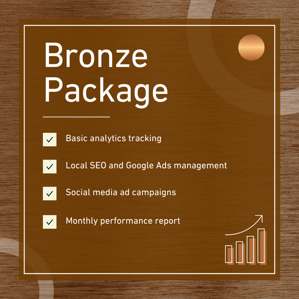 Our Bronze Marketing Solution is designed for businesses looking to establish their online presence and gain initial insights. This package offers basic analytics, helping you track website traffic and understand your audience's behavior. You'll have access to essential marketing platforms such as social media ads and Google Ads, tailored to boost brand awareness and increase local visibility. Ideal for startups or businesses looking to dip their toes into digital marketing without a significant investment.